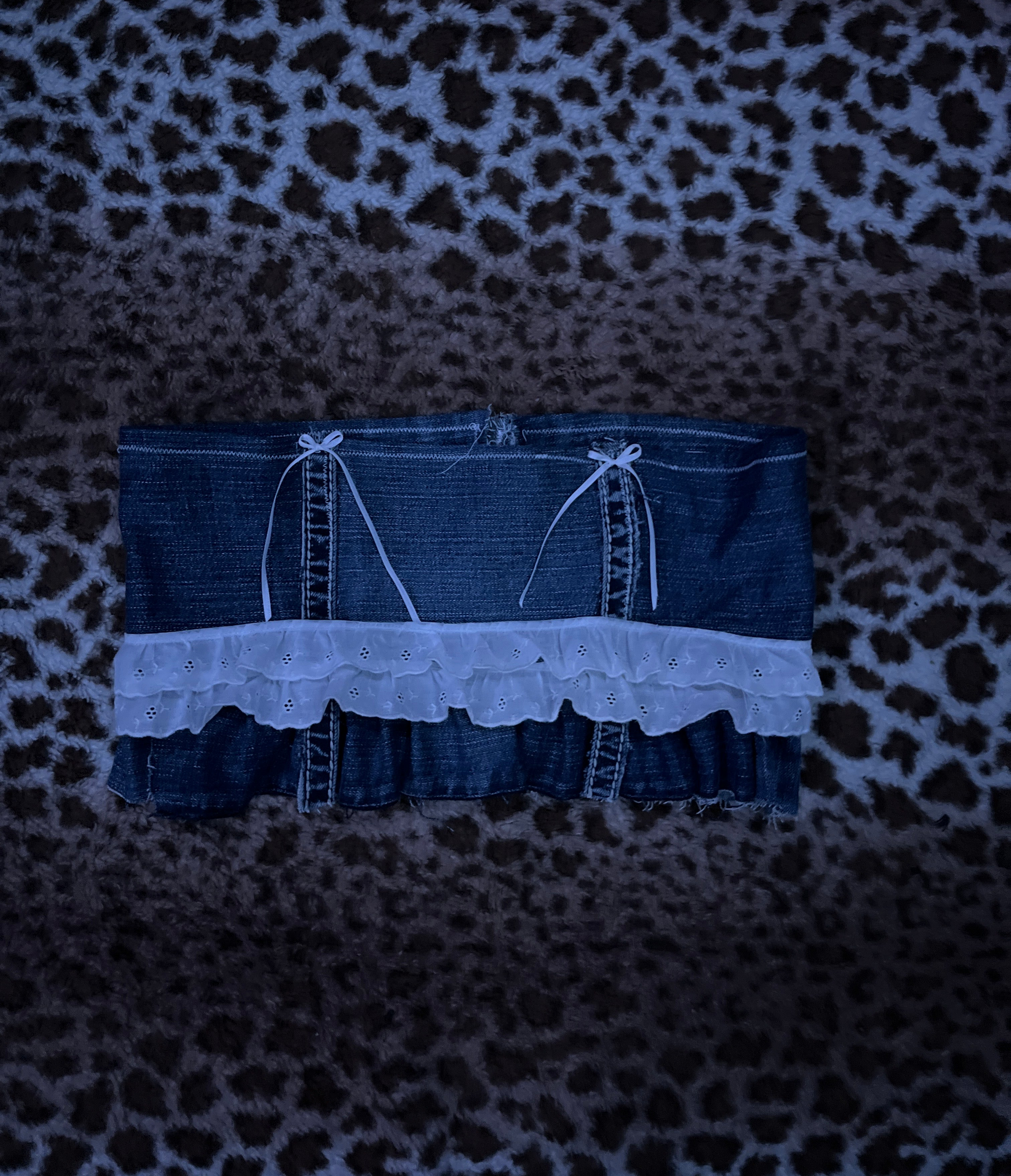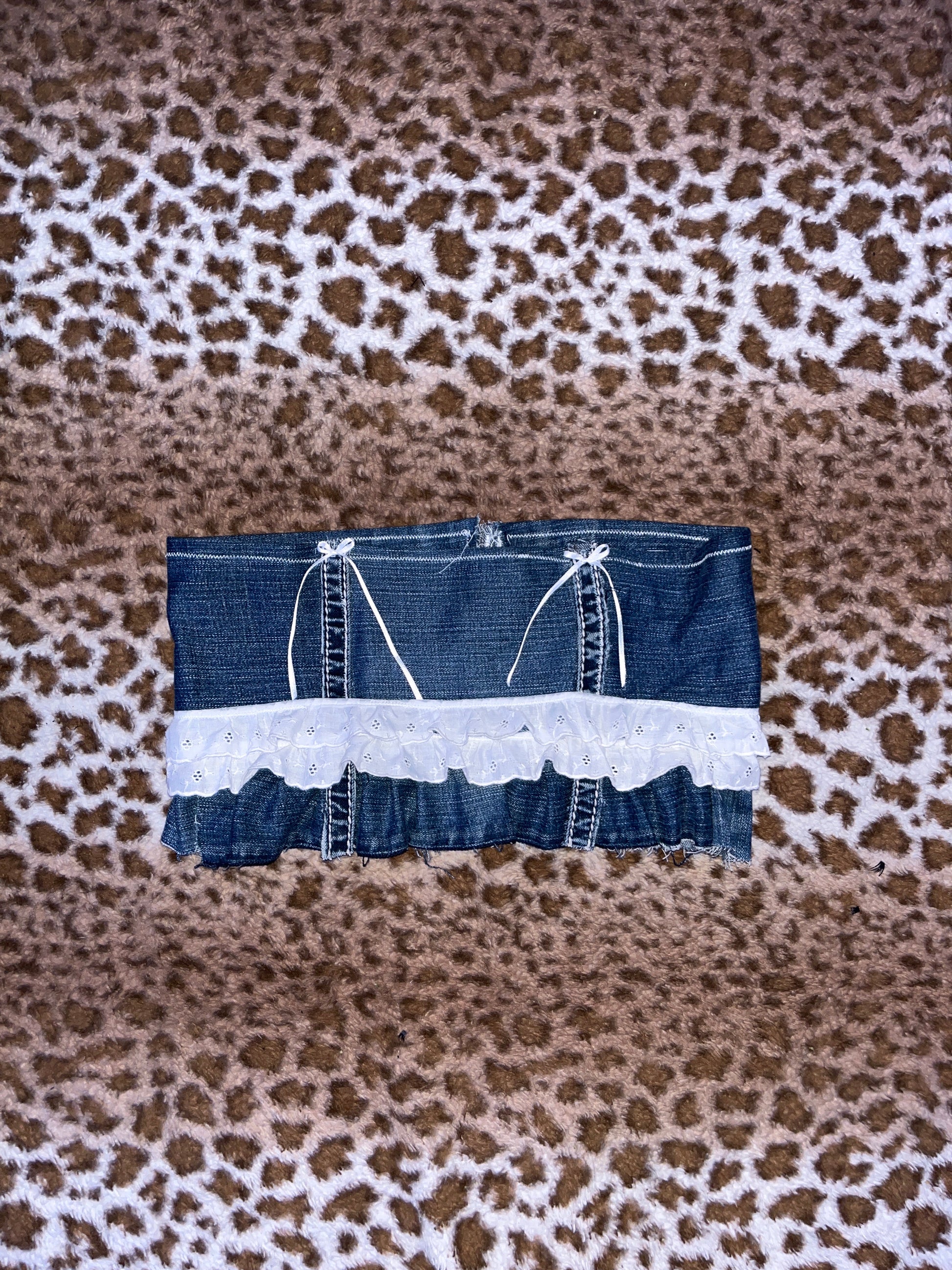 Handmade size small Low rise, miniskirt stretchy denim material with white lace and ribbon bow Layering handmade by me